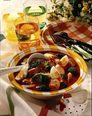 Wash the chives, dab dry and cut into small rolls. Cut the sausage into slices. Stir sauce powder into 1/2 litre of boiling water and let it boil for about 1 minute. Add sausage, broccoli and eggs to the sauce and bring to the boil briefly.