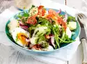 Clean and wash the radicchio and cut into thin strips. Halve the avocado, remove the core and peel the flesh. Dice the avocado finely. Drain tuna and pluck into small pieces. Mix radicchio, avocado and tuna with the vinaigrette, season to taste. Cut the egg into strips. Before serving, mix in bread and serve with egg
