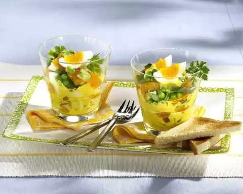Clean, wash and finely chop the spring onions. Cut the eggs into eight pieces. Layer both with peas, mandarins and sauce in 4 glasses. Garnish with chervil. Serve with roasted toast