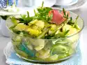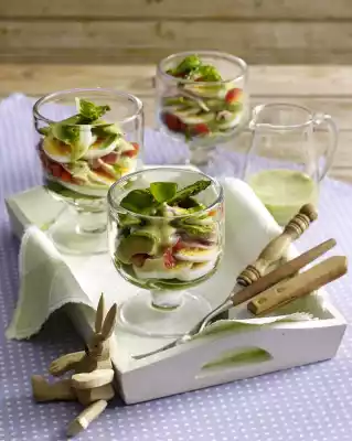 Layer asparagus, peppers, avocado slices, eggs and ham in glasses. Sprinkle with avocado and lemon dressing. Wash ##basil## Garnish ##Salad## with it.