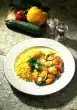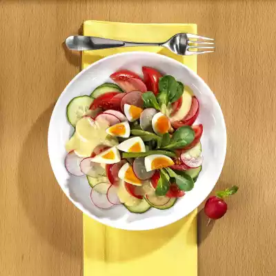Take them out, rinse with cold water and let them cool down. Wash the cucumber and cut into very thin slices. Clean, wash and drain lamb's lettuce. Wash and clean the tomatoes and cut them into narrow slices. Wash radishes and cut into slices. Arrange everything on a plate. For the dressing peel and finely dice the onion. Mix yoghurt, mayonnaise, vinegar, mustard, pepper, salt and diced onion and add to the salad. Cut the eggs into small pieces.
