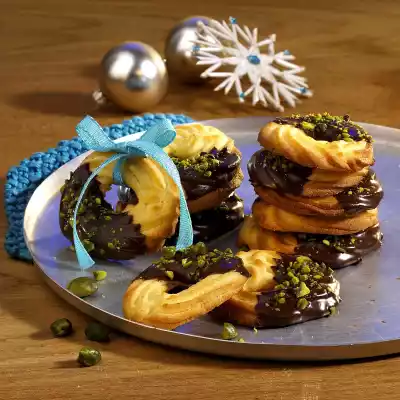 Take out and let cool down. Finely chop the chocolate coating. Melt the chocolate coating and coconut oil in a bowl over a warm water bath. Dip a part of the pastry and sprinkle with pistachios. Let it set on a cake rack in a cool place