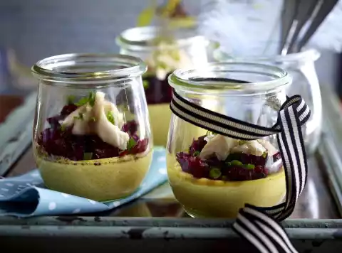 Carefully lift the egg pit glasses out of the pot. Rub glasses dry on the outside. Pluck the fish. Spread beetroot and fish evenly in the glasses, sprinkle with remaining chives