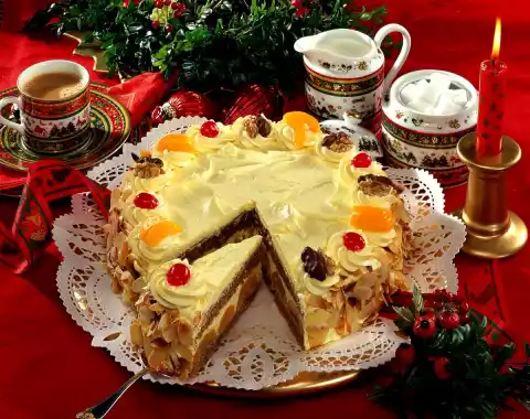 Roast the almonds in a pan without fat and take them out. Break the chocolate into pieces and melt in a hot water bath. Dip the walnut halves half each into the chocolate and let them dry. Cut the rest of the apricots into slices. Halve the cherries. Spread the cake with the rest of the cream, up to 4 tablespoons. Press almonds to the edge. Decorate cake with cream tuffs, nuts, apricots and cherries