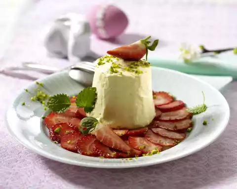 Clean and wash the remaining strawberries, dab dry and cut into very thin slices. Arrange the strawberry slices close together on 4 plates. Dip parfait cups in hot water, loosen the rim with a small knife and turn parfaits out onto the plates. Let thaw for 5 minutes. In the meantime quarter the remaining strawberries. Sprinkle carpaccio and parfait with pistachios, decorate with strawberry quarters and lemon balm