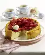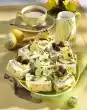 Add half of the cream. Place the rest of the lady fingers on top and spread the rest of the cream on top. Refrigerate for at least 1 hour. Whip the cream until stiff and fill into a piping bag with a star-shaped spout. Spray one tuff of cream onto each cream and sprinkle with the remaining advocaat. Decorate with remaining chocolate pieces, advocaat truffle and mint