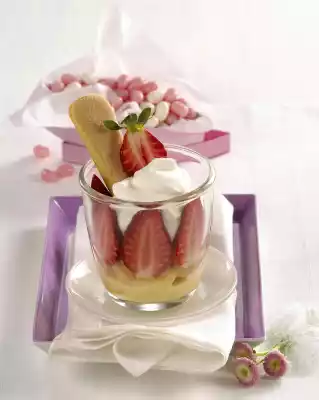 Cut the remaining 2 strawberries in half. Coarsely chop 6 sponge fingers. Spread the crumbs in 4 glasses. Sprinkle each with 1-2 tablespoons of eggnog. Layer strawberries at the edge of the glass. Put cream in the middle. Decorate with 1 sponge finger and half a strawberry.