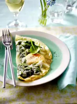 Melt 30 g butter. Cut out 2 circles (approx. 16 cm Ø) diagonally from a filo pastry sheet. Spread circles with butter. Cover one half of each circle thinly with spinach, leaving about 1 cm free at the edges.