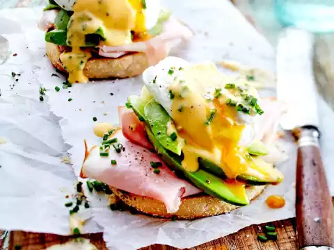Halve the toasties and toast them. Cover toast halves with ham, avocado and eggs, sprinkle with chives and drizzle with the sauce. Sprinkle with coarse pepper.