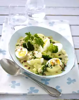 Halve the eggs. Arrange broccoli-bacon sauce and eggs on plates. Sprinkle with parsley and garnish. Boiled potatoes taste good with it.