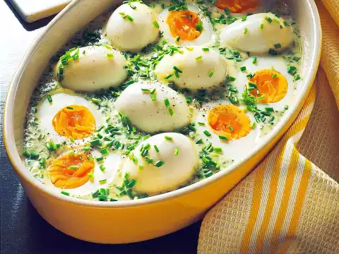 Boil the eggs for about 10 minutes. Melt the fat in a pot at low heat, sauté the flour in it. Deglaze with cream and milk. Bring to the boil while stirring, then simmer on low heat for about 10 minutes.