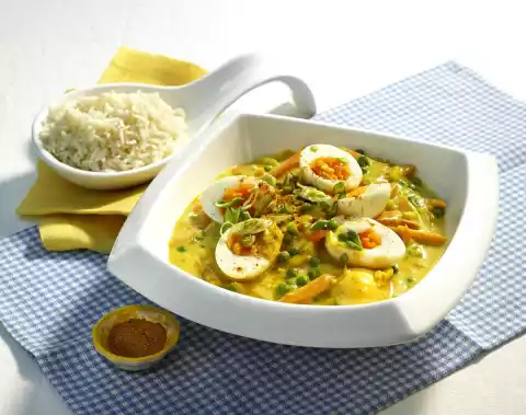 Sprinkle curry and flour over the vegetables and sauté while stirring. Stir in 1/2 l water, cream and stock, bring to the boil. Add peas and simmer for 3-4 minutes and season to taste