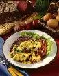 Cover the rice and cook it in boiling salted water at low heat for about 20 minutes. Boil eggs for about 8 minutes. Fry onions in hot fat. Steam carrots and 2/3 spring onions for about 2 minutes