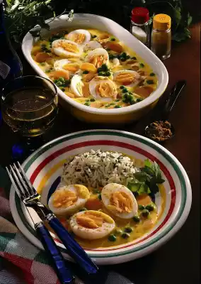 Rinse the eggs with cold water, peel and halve them. Briefly heat the vegetables and eggs in the curry sauce. Wash the parsley, put something aside for garnishing. Finely chop the rest. Drain the rice and mix with the parsley.