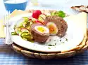 Quench 4 eggs, peel and possibly halve them. Season the sauce with salt and pepper. Heat the eggs in the sauce. Wash the chives, cut them into small rolls and sprinkle over them. Serve everything. Gherkins taste good with it