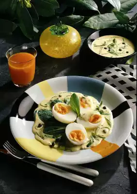 Season to taste with salt, pepper and mustard. Arrange eggs with the sauce on plates and garnish with borage leaves.