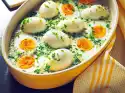 Sweat onion cubes and flour in it. Deglaze with cream and stock. Cook for about 10 minutes at medium heat. Meanwhile, boil eggs in boiling water until they are waxy, rinse and peel. Add herbs and capers to the sauce.