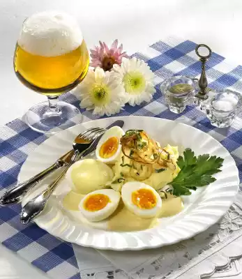 Stir mustard into the sauce. Coarsely chop parsley, except for a few leaves for garnishing. Drain the eggs and chill in cold water. Drain potatoes. Add 150 ml milk and 20 g fat to the potatoes and mash with a potato masher until mashed. Peel the eggs. Arrange mashed potatoes on plates. Sprinkle with onion rings. Halve the eggs and add to the puree with the sauce. Sprinkle parsley over the mashed potatoes. Garnish with parsley leaves