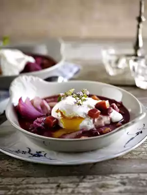 Remove the herb bouquet from the sauce. Season the sauce with salt, sugar and pepper. Arrange sauce with eggs on plates and garnish with thyme stems