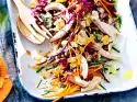 Preheat oven (electric cooker: 200 °C/circulating air: 180 °C/gas: see manufacturer). Line baking tray with baking paper. Clean and hull the mushrooms and place them on the tray with the slats facing upwards. Sprinkle with oil.