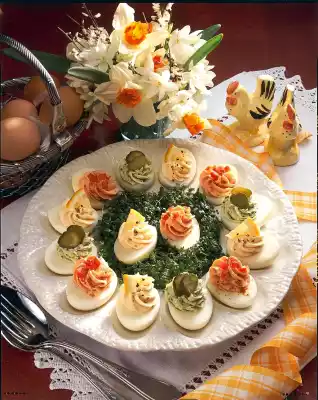 Season one portion with horseradish, the second with tomato paste. Wash parsley, chop finely and stir into the third portion of cheese. Pour the creams one after the other into a piping bag with a star-shaped spout and squirt into 5 or 6 egg halves. Garnish with cucumber slices, tomato cubes, lemon wedges, paprika powder and pepper. Arrange the egg halves with cress on a plate
