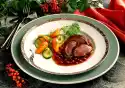 Deglaze with 1/8 litre water and wine and stew covered for about 2 1/2 hours. Turn now and then, gradually pour on 1/2 litre of water. Remove the roast. Sieve the stock, bring to the boil and season to taste. Add sauce thickener and stir in cream. Arrange everything and pour the remaining brandy over the roast before serving. Potatoes, Brussels sprouts and cranberries are delicious with it