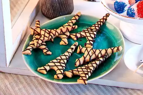 Roll out the dough 3-4 mm thinly on a work surface sprinkled with flour. Cut out approx. 35 Eiffel Towers from the dough (cookie cutters e.g. from Birkmann, approx. 10 cm in size). Knead and roll out the remaining dough again and again. Place the biscuits on two baking trays lined with baking paper and bake them one after the other in a preheated oven (electric cooker: 175 °C/circulating air: 150 °C/gas: see manufacturer) for 8-10 minutes until golden brown. Let them cool down.