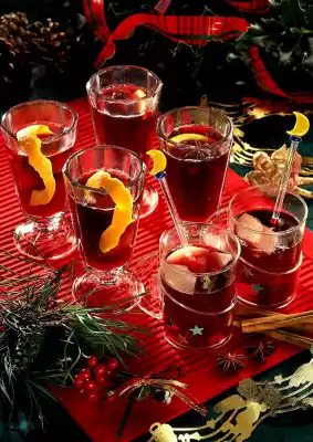 Cut the vanilla pods lengthwise. Boil up elderberry juice, 1/4 litre water, orange juice, cinnamon, star anise, sugar and vanilla beans. Finally add the Köm. Fill into glasses and decorate with orange peel.