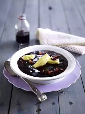 Peel, quarter, core and finely dice the apple. Boil elderberry juice, 60-70 g sugar and lemon juice in a pot. Stir starch and a little cold water until smooth. Stir into the soup and bring to the boil again.