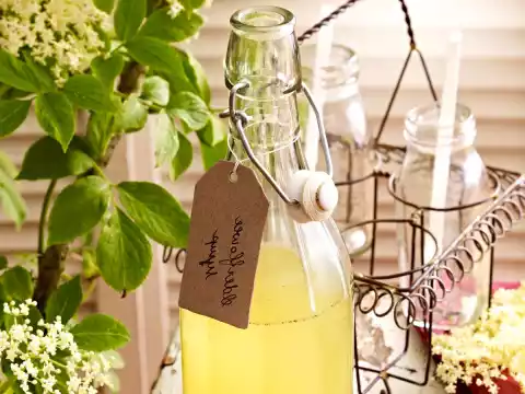 Close bottles well and put them in a cool place. The syrup keeps for about 6 months in the refrigerator. Fill the syrup with water (approx. 1 part syrup and approx. 4 parts water for 1 250 ml).