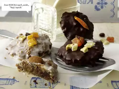 Remove from the heat, add the rest of the couverture and dissolve while stirring. Stir icing sugar and 4-5 tablespoons of water until smooth. Spread half of the gingerbread with icing sugar icing. Dip the rest of the gingerbread in the couverture, drain and place on a grid with the wafer side. Leave to dry. Decorate with dried fruit, almonds, cashew nuts etc.