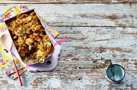 Preheat oven (electric cooker: 200 °C/circulating air: 175 °C/gas: see manufacturer). Grate cheese. Line a large casserole dish (approx. 4 l capacity) with 4 wheat patties, slightly overlapping. 1⁄3 Spread the chopped mass on top.