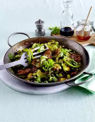 Cut the meat into slices. Clean, wash and chop the vegetables and spring onions. Peel and chop garlic and ginger. Mix soy sauce, mustard and honey.