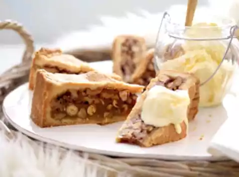 Pour nut caramel onto the dough base. Roll out the rest of the dough into a round shape (approx. 24 cm Ø) and place it on top of the nut caramel. Press the edges of the dough together all around.