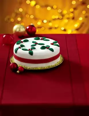 Brush marzipan with the remaining brandy. Knead the fondant until smooth, and roll it out on a work surface lightly dusted with icing sugar to a plate (38-40 cm Ø). Place on the cake in the same way as the marzipan cover, smooth with your hands and press down well. Cut off excess fondant, knead again and wrap in foil (use for other purposes). Tie a golden ribbon around the cake. Arrange gold beads on the plate around the cake and decorate the middle of the cake with star-shaped cookies