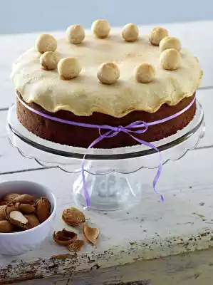 Take the finished cake out of the oven, let it rest in the mould for about 10 minutes, then remove from the mould and let it cool down completely. Roll out 1/3 of the marzipan into a circle (approx. 24 cm Ø) on a work surface sprinkled with icing sugar. Place it on the cake, pressing the edge in wavily. Form the remaining marzipan into 12 balls and arrange them in a circle on the marzipan lid. Bake the cake under the preheated grill of the oven for approx. 5 minutes