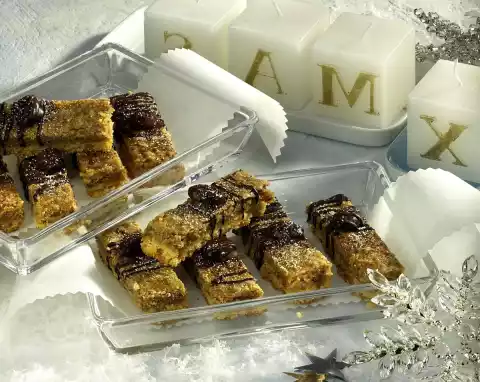 Bake in the preheated oven (electric cooker: 175 °C / convection oven: 150 °C / gas: level 2) for approx. 30 minutes. Let it cool down. Cut off approx. 2 cm of the cake edge all around. Cut the pastry sheet into approx. 65 strips (2.5 x 8 cm each). Melt the glaze on a hot water bath. Decorate nut strips with mocha beans and the icing