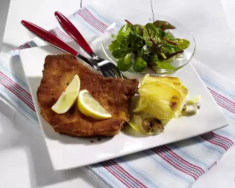 Whisk the eggs in a deep dish. Turn the chops one after the other in flour, egg and breadcrumbs. Heat clarified butter and fry chops in two portions for about 8 minutes each, turning them over. Mix salad and vinaigrette.