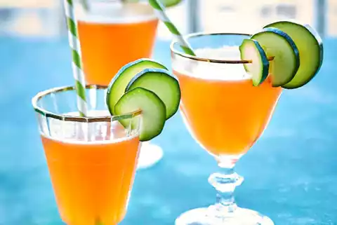 Put grapefruit syrup, freshly squeezed orange juice, passion fruit juice, lemon juice and Escorial Green (herbal liqueur) with ice cubes into a cocktail shaker. Shake vigorously and pour into the glass. Decorate with zucchini slices.
