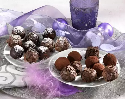 Form about 40 balls with cool hands. Turn in grated chocolate or cocoa, dust some with icing sugar. Store in a cool place