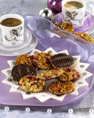 Coarsely chop the chocolate coating and melt in a hot water bath. Stir in espresso powder. Brush the back of the Florentines with it, decorate with a dough comb if necessary. Allow to dry