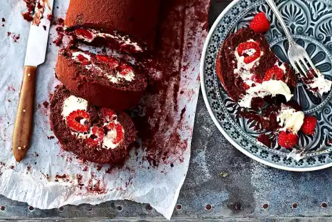 Spread raspberries over the cream. Roll up the sponge cake again using the cloth. Place the roll on a plate. Chill for at least 30 minutes. Dust with cocoa before serving.