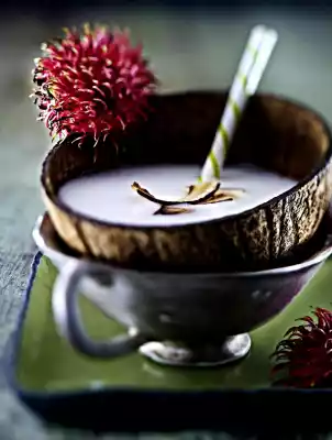 Line a bowl with a clean, damp gauze or tea towel. Add the coconut mixture and squeeze it out with the cloth, collecting the brew. Put the pressed coconut flakes back into the blender. Repeat the process twice with the remaining water, boiling the water again if necessary. Stir lemon juice into the coconut milk and let it cool down. Store in a cool place until serving. Arrange in glasses as desired and serve with e.g. rambutans and roasted coconut chips