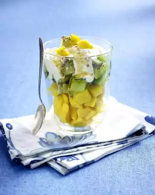 Peel and chop the mango and kiwi. Mix curd and orange juice. Fill mango, kiwi and quark into a glass. Drizzle with honey and sprinkle with sesame