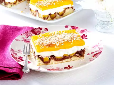 Soak 8 leaves of gelatine. Cut and peel the flesh of 2 mangos from the stone. Finely puree the fruit flesh, 50 g sugar, lemon juice and 4 tbsp water. Heat 3-4 tbsp. mango puree, dissolve gelatine in it. First stir 2-3 tbsp mango puree into the gelatine mixture, then stir everything into the rest of the mango puree. Pour the mango puree onto the 2 cakes, smooth it down and put it in a cool place for at least 2 hours