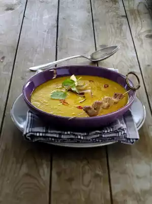 Wash pumpkin, remove seeds, dice flesh. Clean, wash and cut spring onions into rings. Heat 1 tablespoon of oil. Fry the spring onion rings and pumpkin cubes for about 4 minutes. After about 3 minutes dust with curry. Pour in broth, orange juice and coconut milk, bring to the boil and simmer for about 15 minutes