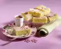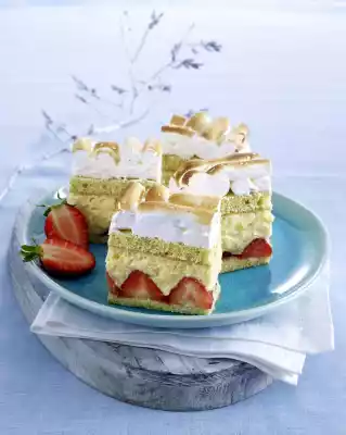 Separate eggs. Beat egg yolks and 120 g sugar until frothy. Beat the egg whites until stiff, while pouring in 50 g sugar. Sift flour and starch and mix with the pistachios. Alternate with the beaten egg white and fold into the egg yolk mixture with a dough scraper. Line a baking tray with baking paper and place an adjustable baking frame (approx. 24 x 26 cm) on top. Fill half of the sponge cake mixture into a piping bag with perforated spout and spray it in strips into the baking frame. Bake in the preheated oven (electric cooker: 175 °C/circulating air: 150 °C/gas: level 2) for approx. 15 minutes. Let cool on a cake rack. Bake a second base from the remaining sponge cake mixture in the same way, also allow to cool. For the rice mixture, soak gelatine in cold water. Peel the mango, cut the flesh off the stone and puree finely. Boil up the milk with the vanilla pod. Add rice pudding and 100 g sugar and simmer while stirring for about 30 minutes until a thick rice pudding is formed. Stir in mango puree and passion fruit juice. Squeeze the gelatine and dissolve it in the rice pudding while stirring. Pour the rice pudding into a bowl and chill. Wash and clean the strawberries. Place a sponge cake base with the baking frame around it. Place the strawberries close together on the sponge cake with the top pointing upwards. As soon as the rice cream starts to gel, whip the cream until stiff and fold it in. Spread the rice cream on the strawberries and spread it evenly. Place the second cake layer on top and press down a little. Chill the cake for about 3 hours until the rice mixture is firm. Remove the cake from the baking frame. Beat the egg whites until stiff, gradually add 150 g sugar and continue beating until the sugar has dissolved and the mixture is shiny. Pour the meringue mixture into a piping bag with perforated spout and squirt onto the cake in strips. Turn the cake 90 ° before each strip, so that the strips form a grid pattern. Brown the meringue with a Bunsen burner. Cut the cake into pieces and serve