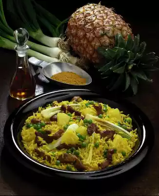 Fry the onions for about 5 minutes, turning them over. Add the frozen peas to the curry rice and cook for about 5 minutes. Cut the pineapple into pieces and add to the rice with the onions. Heat briefly and season with salt and pepper.