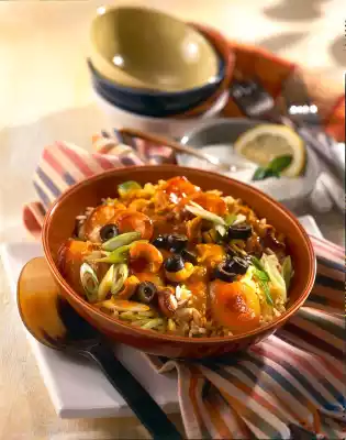 Add garlic, apricots and curry and steam for about 3 minutes while stirring. Add apricot juice, broth and soy sauce, bring to the boil and cook for 1-2 minutes. Season sauce with salt and curry and fold in rice.