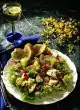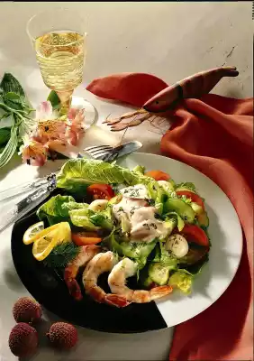 Clean, wash and cut the salad into strips. Wash the tomato and cut into slices. Wash the cucumber and slice thinly. Arrange salad ingredients, lychees and scampi on a plate.